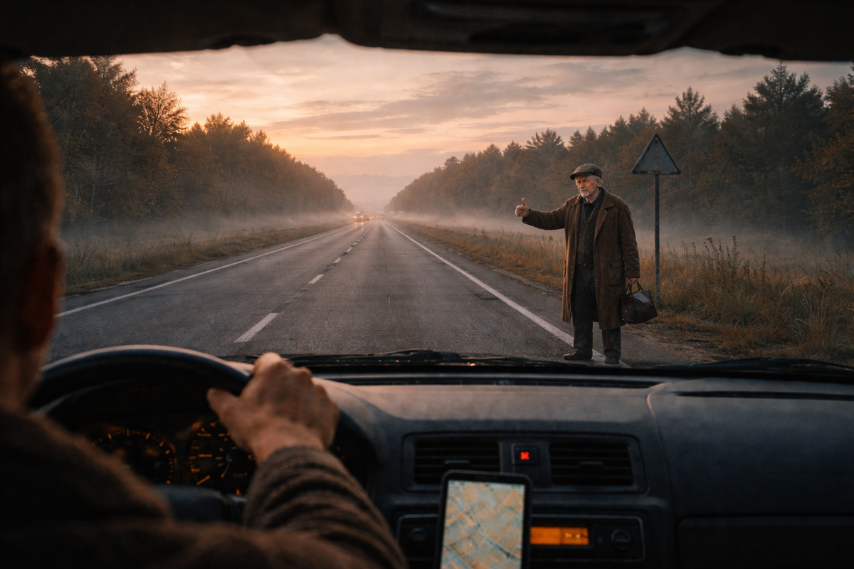 На обочине, возле придорожного знака, стоял старик. Совсем древний, сгорбленный, в видавшем виды пальто. Рука поднята — ловит попутку. Я обычно никогда не останавливался. Мало ли какие люди попадаются. Но что-то заставило меня притормозить. Может, то, что кроме меня на этом пустынном участке дороги не было ни души. Может, его беспомощный вид.