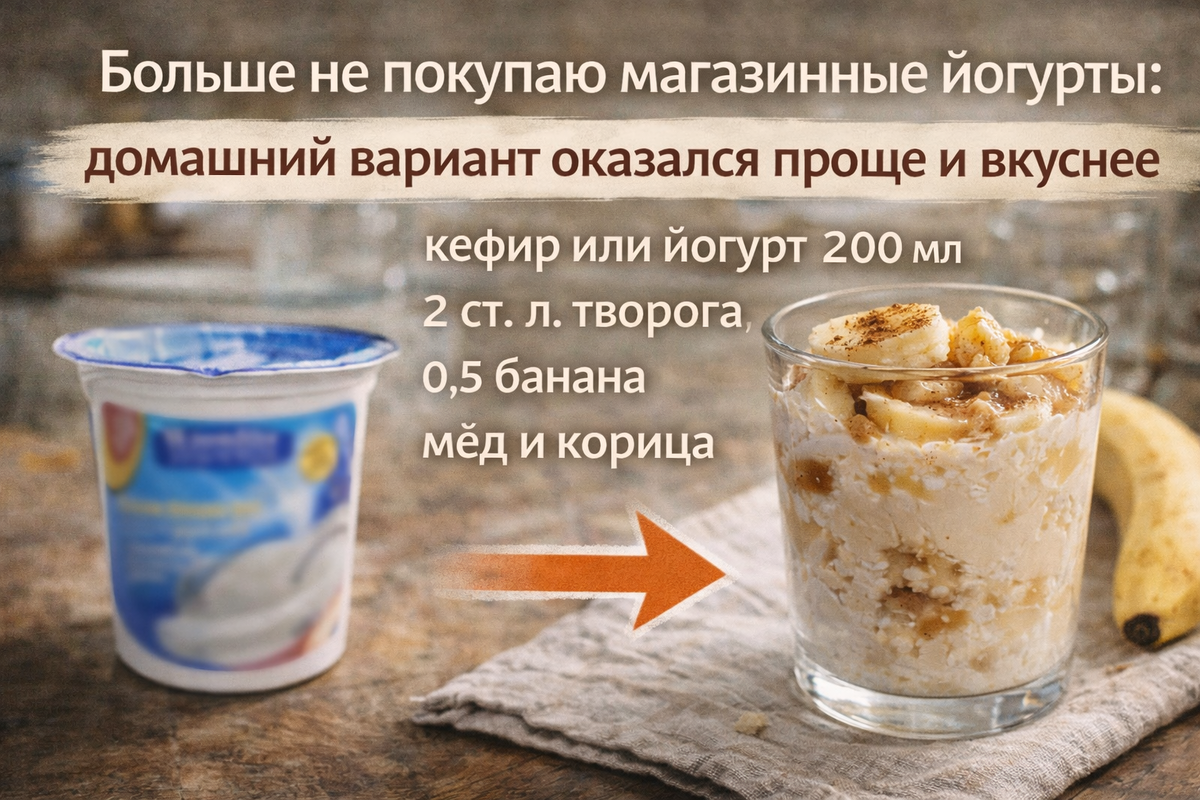 Раньше йогурты покупали редко. Чаще дома были кефир, ряженка или обычный творог. Со временем магазинные йогурты стали привычной частью завтрака, особенно когда нужно быстро поесть. Но многие замечают, что вкус уже не тот, а состав становится всё длиннее. В какой-то момент становится понятно, что простой домашний вариант готовится быстрее, чем поход в магазин. Почему я перестала покупать готовые йогурты Главная причина — насыщение. После сладкого йогурта чувство сытости проходит быстро. Через час снова хочется есть. Домашний вариант работает иначе, потому что в нём меньше сахара и больше настоящей еды. Вторая причина — простота. Оказалось, что ничего готовить специально не нужно. Достаточно соединить несколько обычных продуктов. И третье — вкус можно менять каждый день. Ингредиенты: Смешай кефир и творог до однородности. Добавь нарезанный фрукт и немного мёда. Всё занимает меньше двух минут. Получается густой, мягкий и действительно сытный завтрак. Почему этот вариант оказался удобнее: