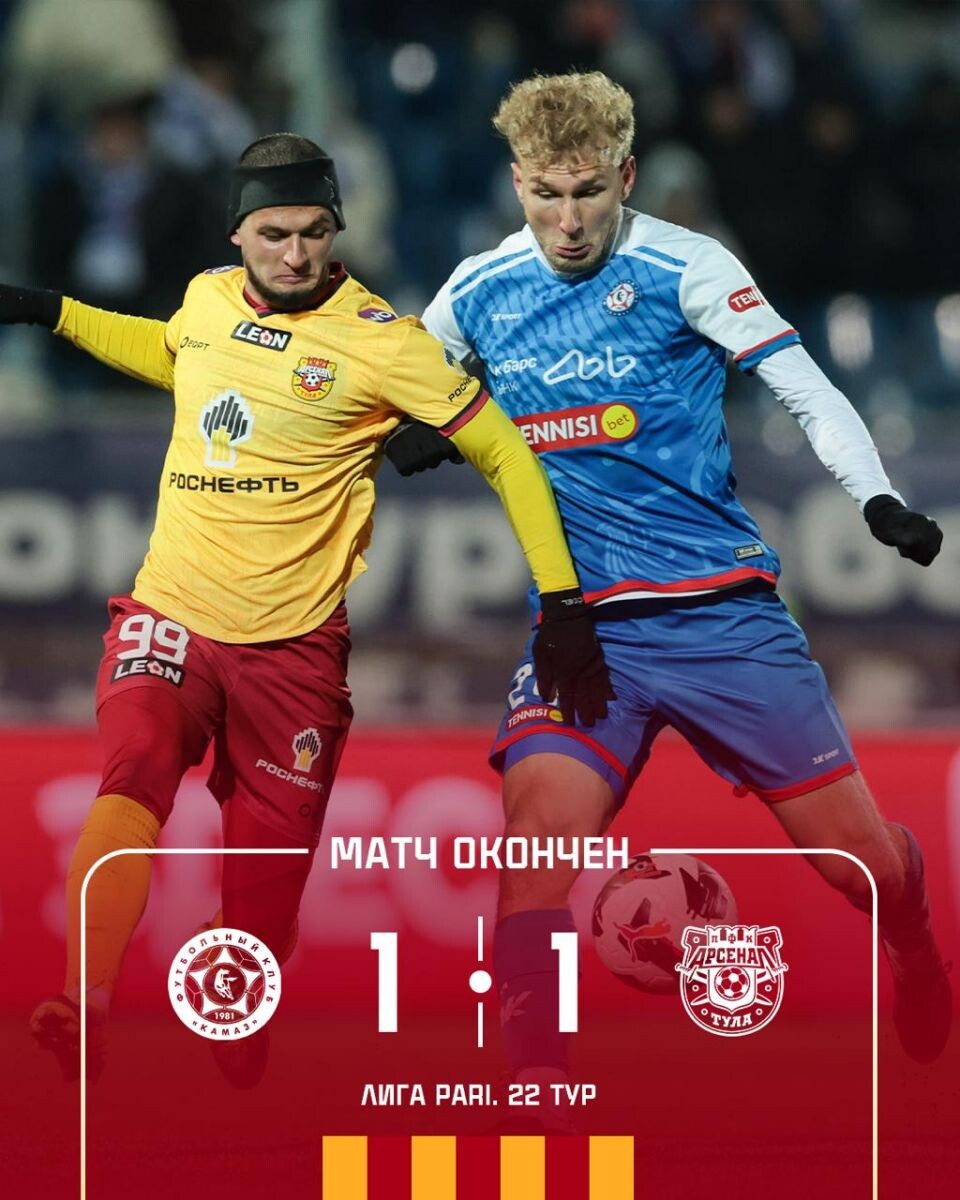 В матче 22-го тура Первой лиги тульский «Арсенал» на выезде встретился с «КАМАЗом». Встреча завершилась вничью 1:1, причем гости упустили победу на последних минутах, пропустив ответный гол незадолго до финального свистка. Первый тайм прошел с преимуществом хозяев поля, однако именно «Арсенал» сумел открыть счет. На 29-й минуте защитник туляков Алинви точно пробил по воротам и вывел свою команду вперед. В первой половине встречи арбитр показал две желтые карточки игрокам «Арсенала»: на 23-й минуте предупреждение получил Пенчиков, на 37-й — Гулиев. Во втором тайме гости продолжили атаковать и создали несколько опасных моментов, которые могли упрочить их преимущество. На 69-й минуте третью желтую карточку в составе «Арсенала» заработал Раздорских. На 86-й минуте нападающий Рейес вышел один на один с вратарем, однако не сумел нанести четкий удар — сил для завершения атаки не хватило, и момент остался нереализованным. Уже через минуту, на 87-й, хозяева добились своего: игрок «КАМАЗа» Семен