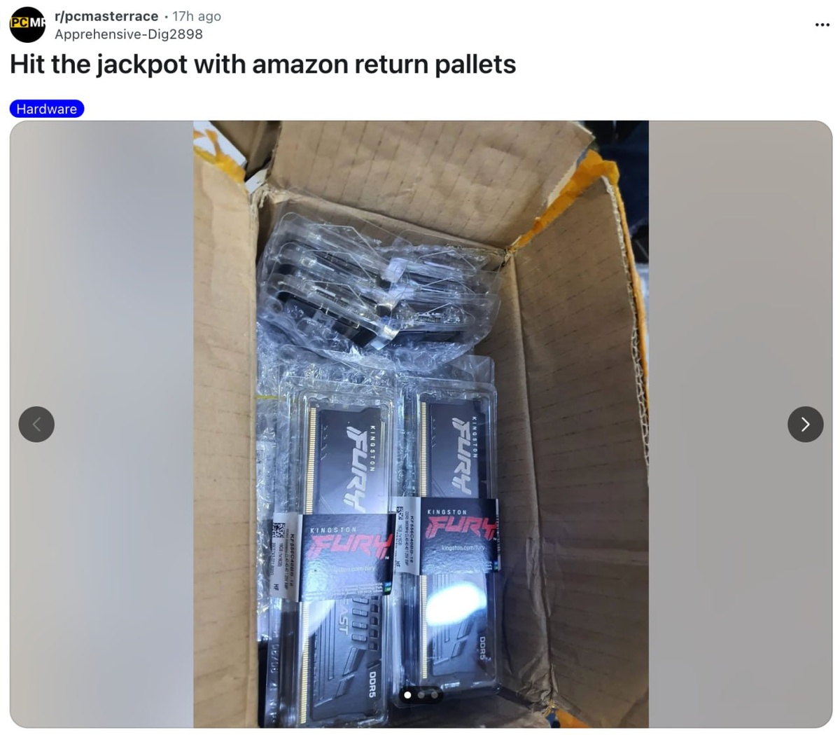 Он заказал 25 кг коробок с Amazon, и в одной из них его ждал настоящий джекпот. Один комплект Kingston Fury в среднем стоит $470 (₽36 тыс.). Парень потратил всего $100 на свой заказ, а **заработал почти $18 тыс**. До сих пор он не может прийти в себя от шока. Постмейкер - автоматическое ведение канала 🤖 Анимация | СhatGPT-4 | Помощь с резюме
