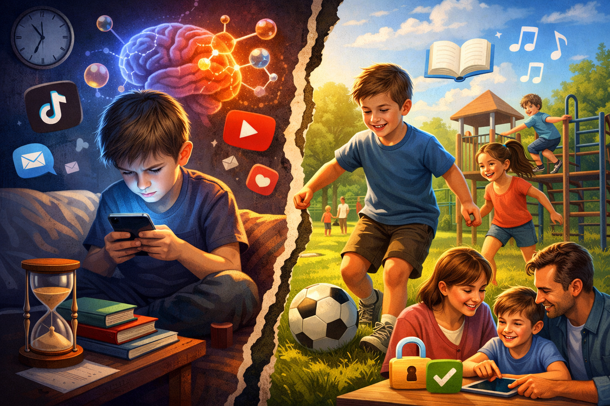Смартфон + интернет + TikTok или YouTube = быстрый дофамин как нейромедиатор удовольствия, который формирует привыкание и перегружает нервную систему; живое общение + детская площадка + офлайн-игры = развитие социальной адаптации и эмоционально-волевой сферы без риска зависимости от гаджетов.