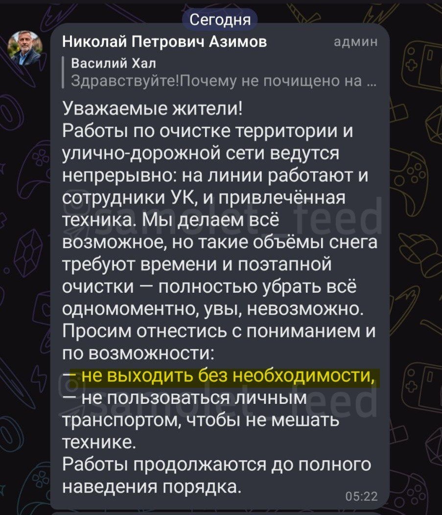 Официальный представитель УК "Азимут" рекомендует не выходить из дома без необходимости, когда в ЖК идут работы по очистке территории