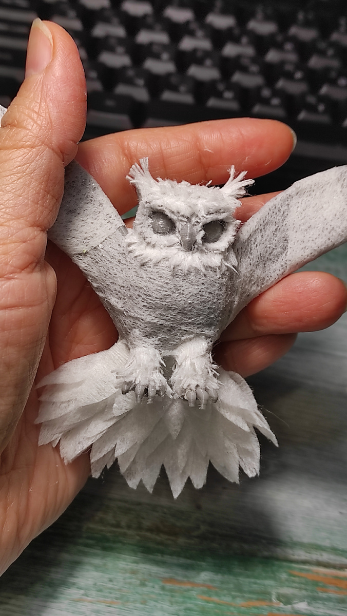 Сегодня покажу над чем работаю. Пока сохнет один из этапов шлифовки куклы и её туфли, я работаю над совой. Основа совы была распечатана на 3д принтере, а потом обклеена. Обклеена для того, чтобы не просвечивался цвет пластика через перья. Теперь на эту тушку потихоньку наращиваю перья. Перья маленькие 5 мм, поэтому работать приходится пинцетом. Отсюда и долго. но зато уже виден характер совы. Самое непростое было сделать пушистыми лапки и голову. Нужно было придумать как это лучше сделать. Сова небольшая, 5,7 см. Она будет сидеть на посохе. Скоро покажу готовый посох с совой, ну а пока как есть.