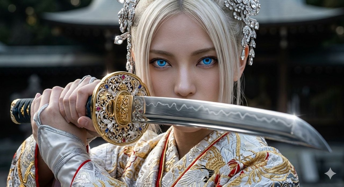 Как вам такая тематика? Лайк - круто. Дизлайк - не очень. Центральный объект: Гиперреалистичный крупный план (extreme close-up) девушки-самурая, держащей катану перед лицом. Лицо и внешность: похожа на любую девушку: например, овальное лицо, тонкий нос, пронзительные светящиеся ярко-голубые глаза с детализированной радужкой, холодный и решительный взгляд. Волосы платинового блонда, прямые, с тонкими прядями, падающими на лоб, украшенные сложными заколками из серебра и кристаллов. Меч (Катана): Клинок направлен в сторону камеры, создавая эффект глубины (foreshortening). Гарда (цуба) невероятно детализирована: массивная, из резного золота и серебра с инкрустацией драгоценными камнями и филигранью. Сталь клинка зеркально отполирована с видимой линией хамон. Одежда: Роскошное японское кимоно в белых и серебристых тонах, расшитое золотыми нитями и красными узорами. Текстура ткани — парча с объемной вышивкой. Освещение и стиль: Кинематографичное освещение, игра бликов на металле и укра