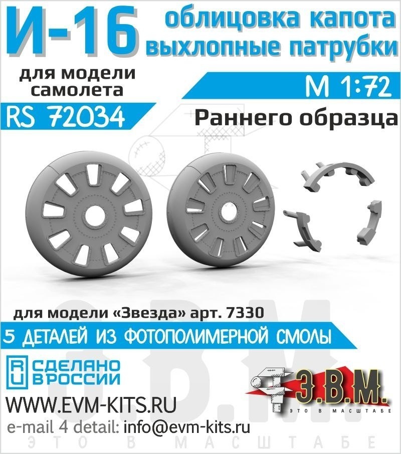 В.М. выпустила на 3D-принтере лобовой капот раннего образца и выхлопные патрубки для модели И-16 тип-5 в масштабе 1/72 от "Звезды": И-16 облицовка капота выхлопные патрубки (каталожный номер RS72034)