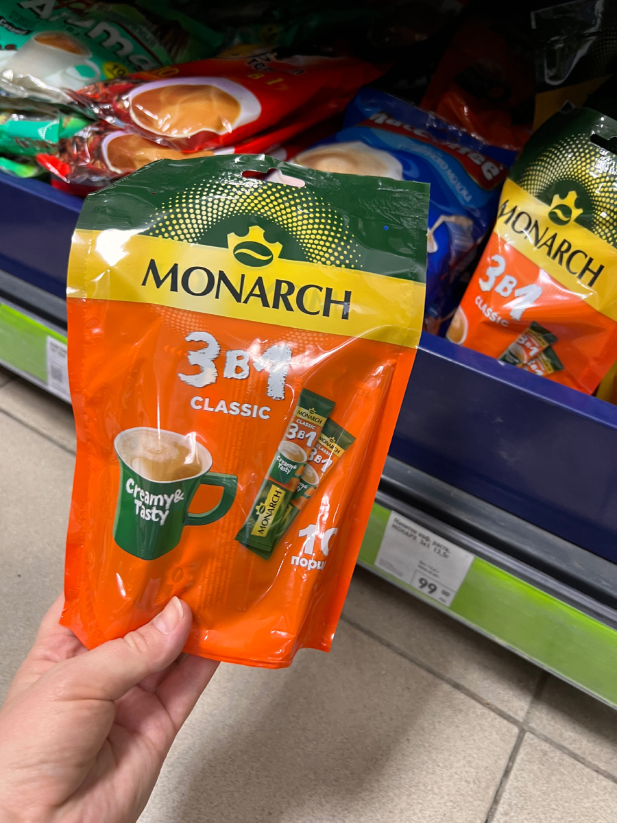 Если утро начинается не с кофе, то это какое-то неправильное утро, поэтому хватаем упаковку Monarch 3-в-1. Это идеальный вариант для тех, кто слишком ленив, чтобы возиться с туркой, но очень хочет взбодриться «сливочно и вкусно». Главное — не выпить все 10 пакетиков за один присест, хотя соблазн велик!