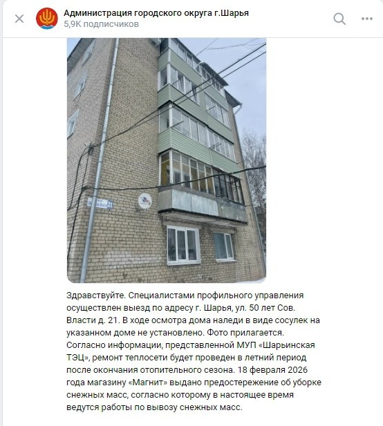 ». Ранее Мной была сделана публикация, в которой был показан обледеневший многоэтажный дом на улице 50 Лет Советской Власти, а также ненадлежащее состояние рядом расположенной теплотрассы. Помимо сделанной публикации Я также обратился в администрацию городского округа города Шарья и в управление ЖКХ. Мной было предложено: 1. Убрать наледь с многоэтажного дома. 2. Отремонтировать теплотрассу на 50 Лет Советской Власти. 3. Обязать собственника магазина «Магнит» вывезти снежную кучу. Сегодня Мне поступили ответы из администрации города и управления ЖКХ. В настоящее время наледь на многоэтажном доме отсутствует; теплотрассу починят летом, так как потребуется около одной недели на замену металлических труб; собственнику магазина выдано предписание. Данная публикация не направлена на нарушение закона и чьих-либо прав. 27.02.2026 год. Шарья – столица мира Крупнейшее городское СМИ Источник: Открыть
