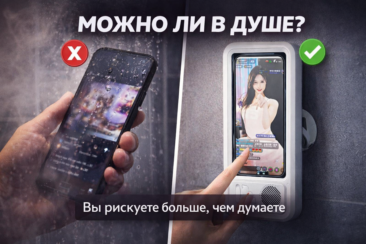 Но при этом почти никто не задумывается, как влага и пар влияют на смартфон. В конце статьи я укажу ссылку и артикул решения, о котором пойдёт речь — для тех, кто захочет подробнее изучить вариант на Яндекс Маркете. Телефон не обязательно ронять в воду, чтобы он начал выходить из строя. Даже если корпус защищён от брызг (IP67/IP68), в ванной присутствует: 📌 По данным производителей электроники, именно конденсат является частой причиной скрытых повреждений — влага может проникать через микроскопические зазоры динамиков и разъёмов. Влага постепенно: И это происходит не за один раз, а постепенно. Даже смартфоны с влагозащитой рассчитаны на: Они не рассчитаны на ежедневное воздействие горячего пара. Более того, влагозащита со временем ослабевает — прокладки и уплотнители стареют. Именно поэтому специалисты рекомендуют минимизировать контакт устройства с влажной средой, даже если защита заяв