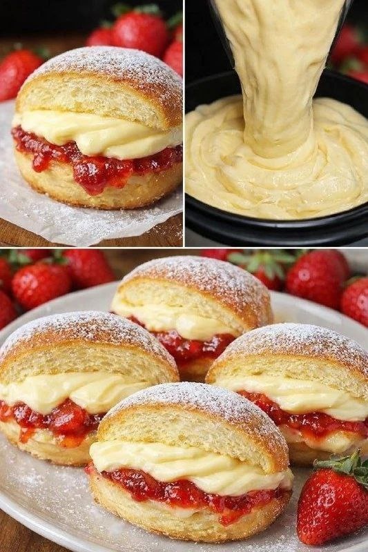ЭТО НЕ ПРОСТО ПОНЧИКИ — ЭТО НАСТОЯЩИЕ БОМБОЧКИ С НАЧИНКОЙ! ПЫШНЫЕ, РУМЯНЫЕ, С СОЧНОЙ КЛУБНИКОЙ И НЕЖНЕЙШИМ КРЕМОМ — УСТОЯТЬ НЕВОЗМОЖНО