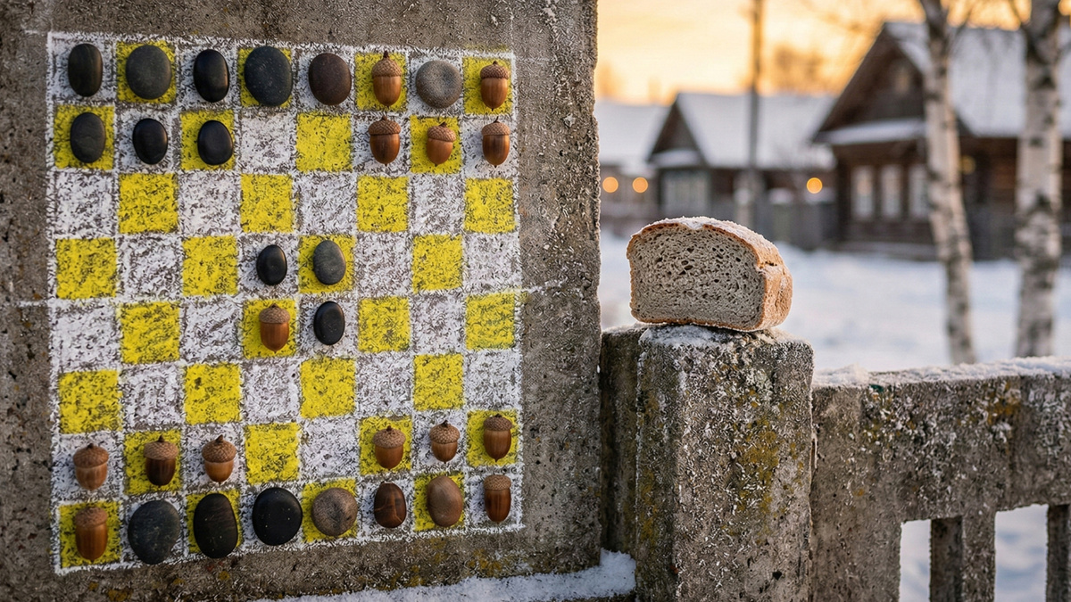 На бетонной плите была нарисована шахматная доска. Мелом. Белые клетки – белым, тёмные – жёлтым. Аккуратные, ровные квадраты, восемь на восемь. На клетках – фигуры. Камешки – тёмные, гладкие, с реки. И жёлуди. Камешки играли за одну сторону, жёлуди – за другую.