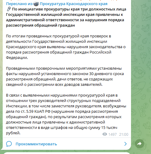 И это еще не все посты (статьи) на официальном канале прокуратуры Краснодарского края о привлечении должностных лиц ГЖИ Краснодарского края к административной ответственности за нарушения при рассмотрении обращений граждан. Как видно, за редким исключением, за раз, к ответственности привлекаются сразу несколько должностных лиц госжилинспекции края. И частота таких привлечений - примерно, раз в 2-3 месяца. Т.е. несколько раз в год, прокуратура края вынуждена привлекать к ответственности сразу несколько сотрудников ГЖИ Краснодарского края. О чем это говорит? Очевидно - в ГЖИ Краснодарского края полностью завалена работа по рассмотрению обращений граждан. Но, как видим из материалов на канале прокуратуры Краснодарского края, прокуратура тратит рабочее время не только на регулярное привлечение к ответственности сотрудников ГЖИ КК, но и на лекции, на которых присутствует лично руководитель ГЖИ КК Шеян Ю.А. И на этих лекциях разъясняются типовые ошибки и пути их исправления. Но это всё ни к