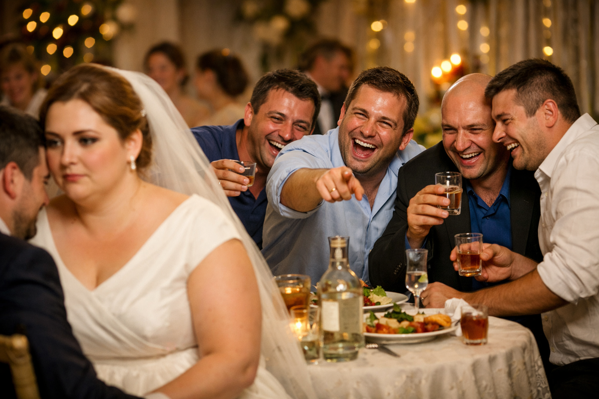 Но за одним из дальних столов, где сидели старые школьные друзья жениха, атмосфера была иной. Там смеялись не с тамадой, а над невестой.
