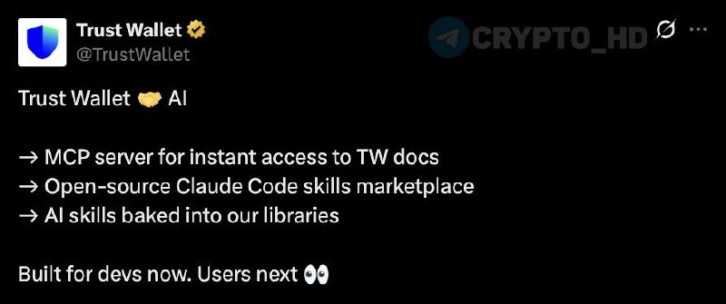 🤖 В Trust Wallet появилась поддержка AI-агентов. Теперь AI-агенты могут напрямую взаимодействовать с кошельком. Ранее: - Circle и JPMorgan - MoonPay Agents - инфраструктура от Stripe - кошельки для AI-агентов Crypto Headlines
