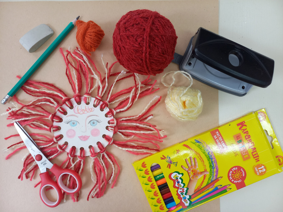 Ожидаемый результат: яркая поделка в виде солнышка с лицом и лучиками из пряжи, которая может использоваться как украшение или сувенир.