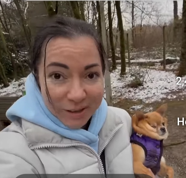 Женщина прогуливается по двору с собачкой и рассказывает о ситуации с жильём в Германии. Показывает соседний дом.
