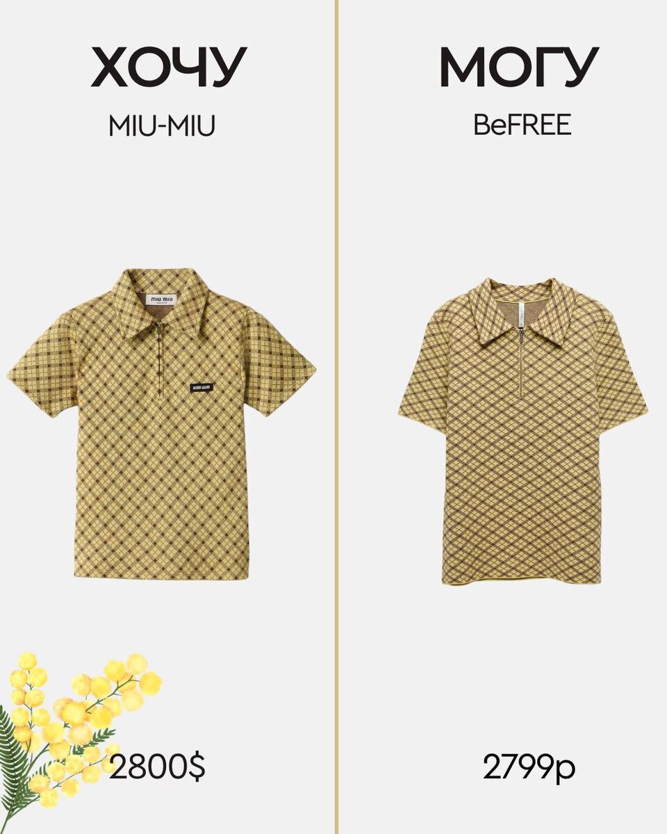 Яркое поло в винтажном стиле из новой коллекции «BeFree» не отличить от поло «Miu-Miu»весны 2025г.