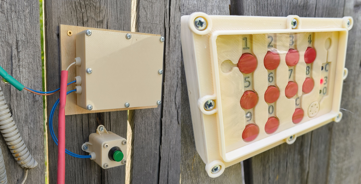 Эх, давно ничего не публиковал. Есть у меня статейка о кодовом замке, который был собран из подручных и остаточных материалов. Спустя полтора года после его внедрения на забор, где он благополучно существовал и работал, решил немного расширить функционал, а затем более продвинутый установить вместо первого варианта, а тот самый первый прилепить в другом месте. Во-первых, сразу отделил мух от котлет. Клавиатура за забором, логика в ограде. Во-вторых, отказался от покупной матричной клавиатуры в пользу самодельной. Имеем десять цифровых кнопок с шагом 500 мВ. Можно уменьшить шаг и натолкать ещё какие-нибудь буквы при желании. В третьих, добавил звуковой сигнал и для внутренней кнопки открывания двери сделал задержку на RC цепи, поэтому при выходе из ограды звук затухает:)) Функциональная кнопка одна (в том варианте, который живёт на заборе уже почти год). Вопрос с попаданием воды внутрь через кнопочные отверстия решил с помощью прозрачной плёнки ПВХ толщиной 0,3 мм по-моему. Переживал за
