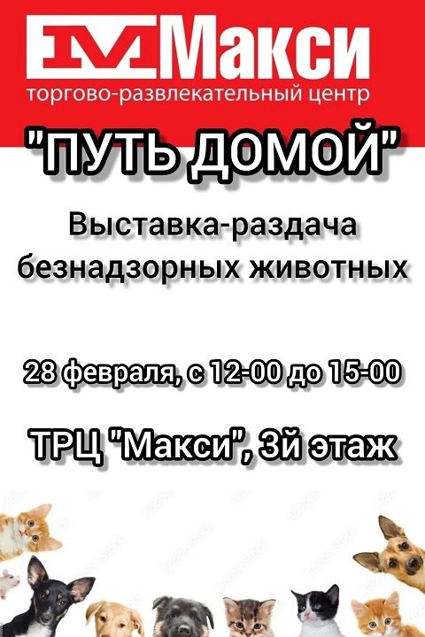 Завтра, 28 февраля, в ТРЦ «Макси» пройдет выставка-раздача бездомных животных под названием «Путь домой». Мероприятие начнется в 12:00 и продлится до 15:00. ⬇️ Подписывайтесь на «Рабочий путь», чтобы всегда быть в курсе! 💙 «РП» в MAX
