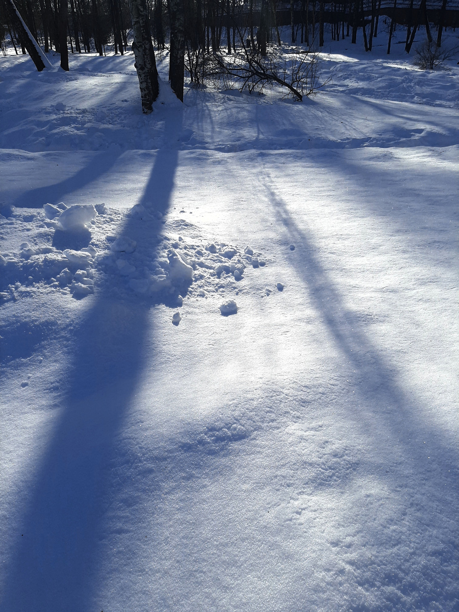 На снегу лежали тени. Солнце с каждым днем светило все ярче и ярче. Оно стало даже пригревать. И вот, просвечивая сквозь деревья, свет создал тени.