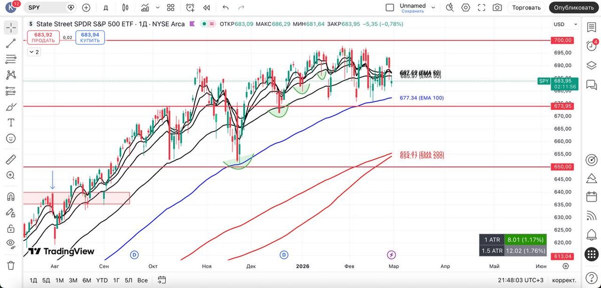 Осталась неопределенность, новых подсказок нет, и сценарий более глубокого пулбэка к 200 EMA D по $QQQ и $IXIC также остается актуальным — держим это в голове. Ждем закрытия недельных свеч. По крипте всё то же самое: $BTC показал реакцию на 20 EMA D — тренд для него остается «медвежьим», и по крипторынку я ничего не делаю. И заметьте, я ничего не теряю из-за этого, а спокойно жду в кэше. Может быть, рано закрыл свои шорты по фондовому рынку? И на выходных может появиться какая-нибудь негативная новость, после которой рынки в понедельник откроются сквизом вниз? 🧐 Никто не знает… Всем отличных выходных😎 #spy #технический_анализ #америка #трейдинг_сша #фондовый_рынок #обзор #вывод #qqq #vix #smh #mags #xlk #ixic #крипта #btc