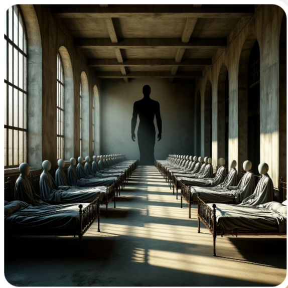 Я иду за ним. Мы поднимаемся на второй этаж. Он открывает дверь в огромный зал — и у меня перехватывает дыхание. Там, вдоль стен, стоят кровати. Много кроватей. И на каждой — человек. Они лежат неподвижно, истощённые, измученные, как будто сама жизнь по капле вытекла из них.
