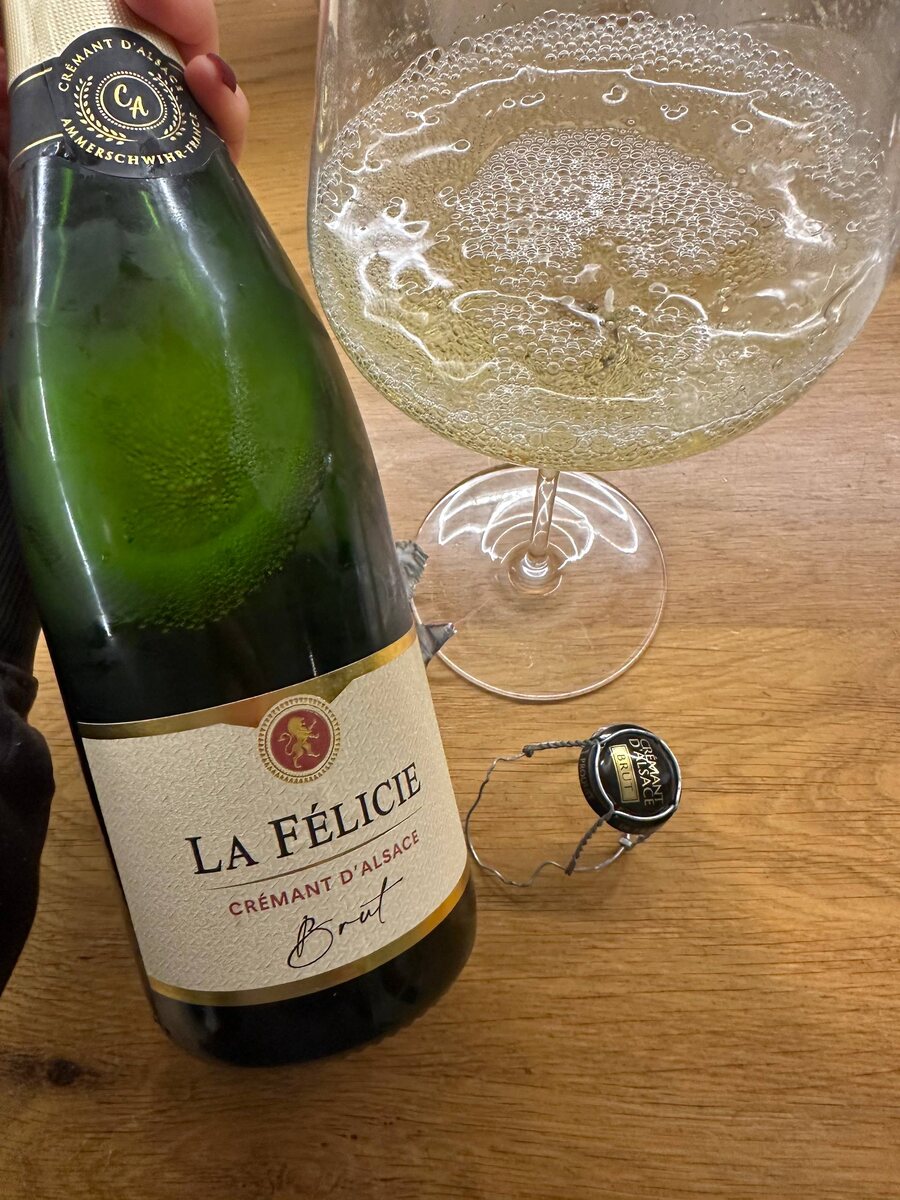 ! 🍾 Креман из Пятерочки La Felicie Cremant d’Alsace. Франция, урожай 2021, розлив 2024, 12%. Оксеура, пино блан. Пятерочка 1399₽ 1049, а то и 699 🤩 В аромате пыль, молочный крем, явная бензольная нотка, масло, немного яблочного пирога. Во вкусе сочные желтые яблоки с косточковой горчинкой в послевкусии. Немного дрожжей и сладкой цедры. Возьму ещё! 💔Но! Ощущение, что бутылки сильно отличаются от магазина к магазину. Предыдущий опыт тут. #игристое #белое #франция