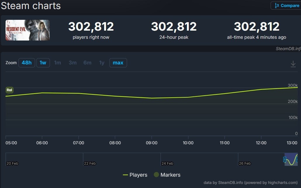 Тем временем пиковый онлайн Resident Evil Requiem в Steam перешагнул отметку в 300к пользователей