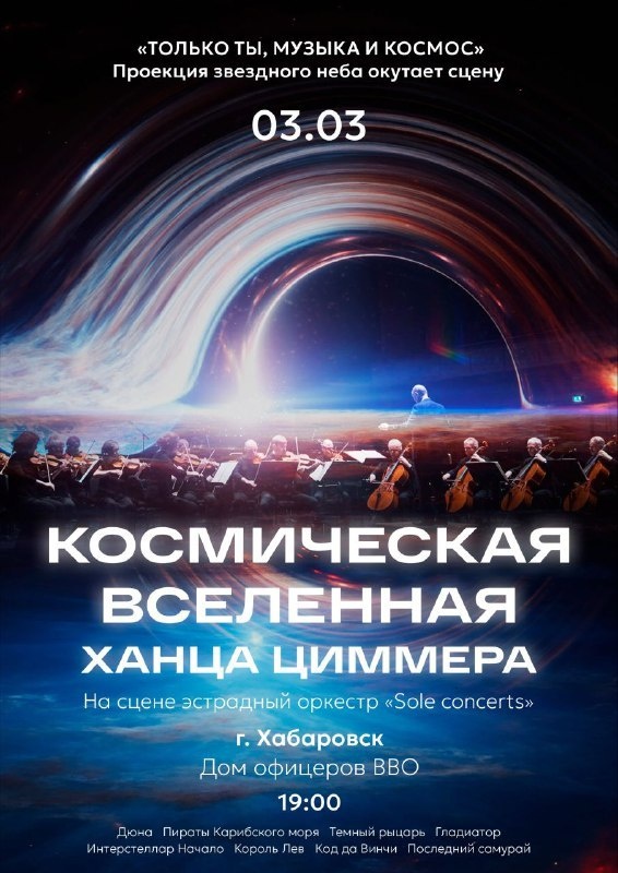 🌌 В этот вечер вы сможете насладиться легендарными саундтреками Ханца Циммера, исполняемыми эстрадным оркестром. Представьте себе: выключенный свет, и перед вами открывается волшебный мир космоса. На экране — проекция черных дыр, комет и туманностей, а в воздухе раздаются ноты вечных приключений. Это будет не просто концерт, а погружение в атмосферу бескрайней вселенной! 📅 Когда: #3_марта в 19:00 ⛳ Где: Дом офицеров ВВО, ул. Шевченко, 16 💳 Стоимость: 1980–3520 ₽ Билеты 👉 Афиша Хабаровска. Куда сходить, экскурсии