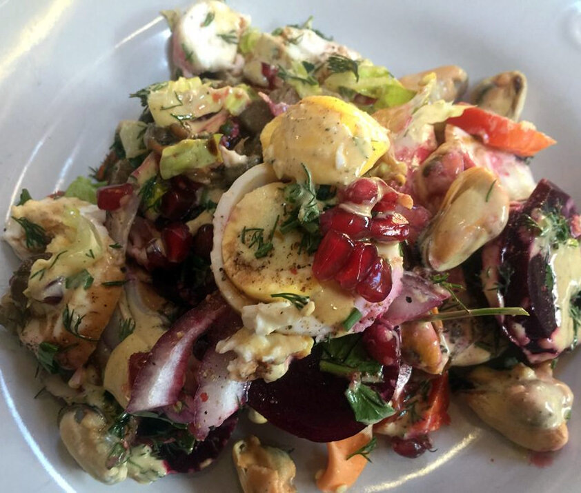 ✔ Мидии (очищенные, варёно-мороженые) — 150 г; ✔ Вёшенки (свежие) — 120 г; ✔ Яйца варёные — 2 шт.; ✔ Фасоль белая консервированная — 100 г (вес без жидкости); ✔ Салат романо — 80 г; ✔ Перец болгарский красный — 70 г; ✔ Лук красный сладкий — 50 г; ✔ Свекла (варёная) — 60 г; ✔ Укроп свежий — 15 г; ✔ Петрушка свежая — 15 г; ✔ Гранат (зёрна) — 30 г. Для заправки: ✔ Яйцо сырое — 1 шт.; ✔ Масло оливковое —2 ст. л.; ✔ Соус соевый —1 ст. л.; ✔ Перец чёрный молотый —по вкусу. Мидии отварить до готовности. Вёшенки обжарить на сковороде до золотистого цвета. Яйца сварить вкрутую. Свеклу отварить или запечь до готовности, остудить и очистить. Все ингредиенты нарезать: мидии (если крупные), яйца, перец, лук, свеклу — кубиком или ломтиками, салат романо порвать руками. Зелень мелко нарубить. Фасоль промыть от консервирующей жидкости. Гранат очистить от кожуры и перегородок. Соединить в глубокой миске мидии, яйца, вёшенки, фасоль, перец, лук, свеклу, салат и зелень. Аккуратно перемешать. Приготовить