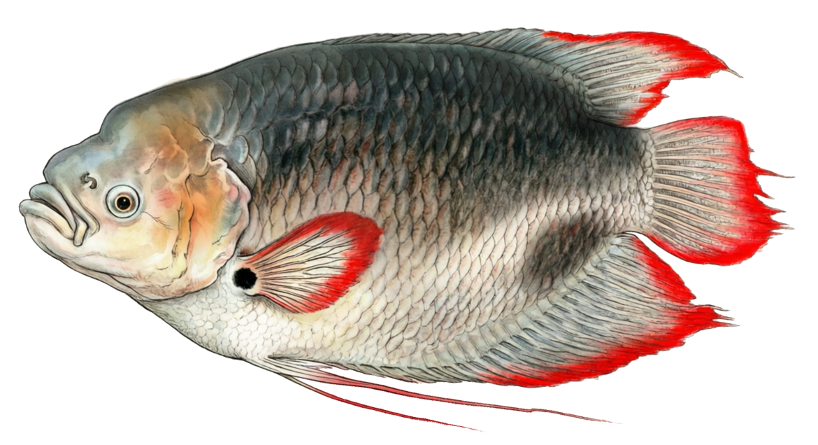 - От близкородственного обыкновенного гигантского гурами (Osphronemus goramy) отличается прежде всего красной каймой плавников и более скромными размерами.