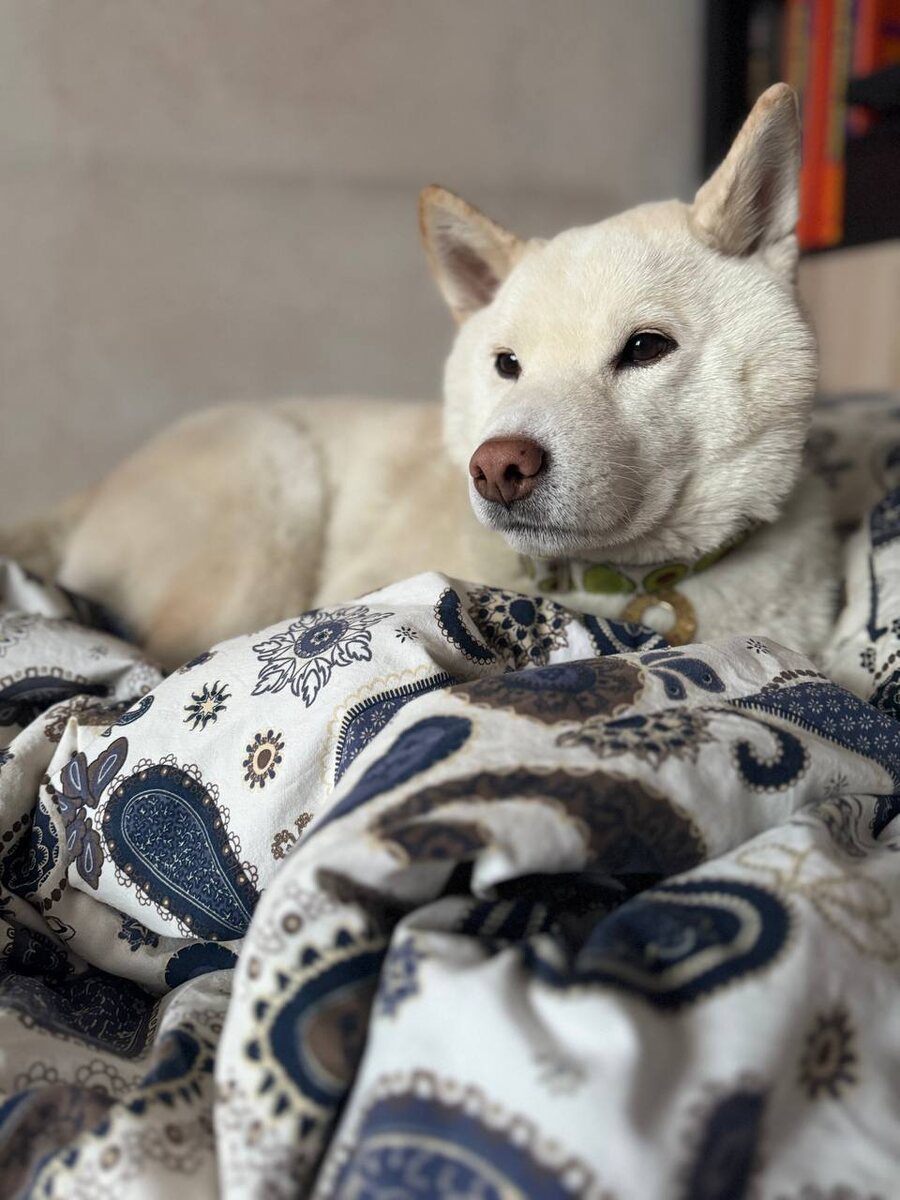Здесь на фото - 8:30 утра, и пес не собирается никуда идти, ни в какую наружу. Гулять? Тебе надо, ты и гуляй - спасибо, кстати, что лежанку освободила, уютная! 😆