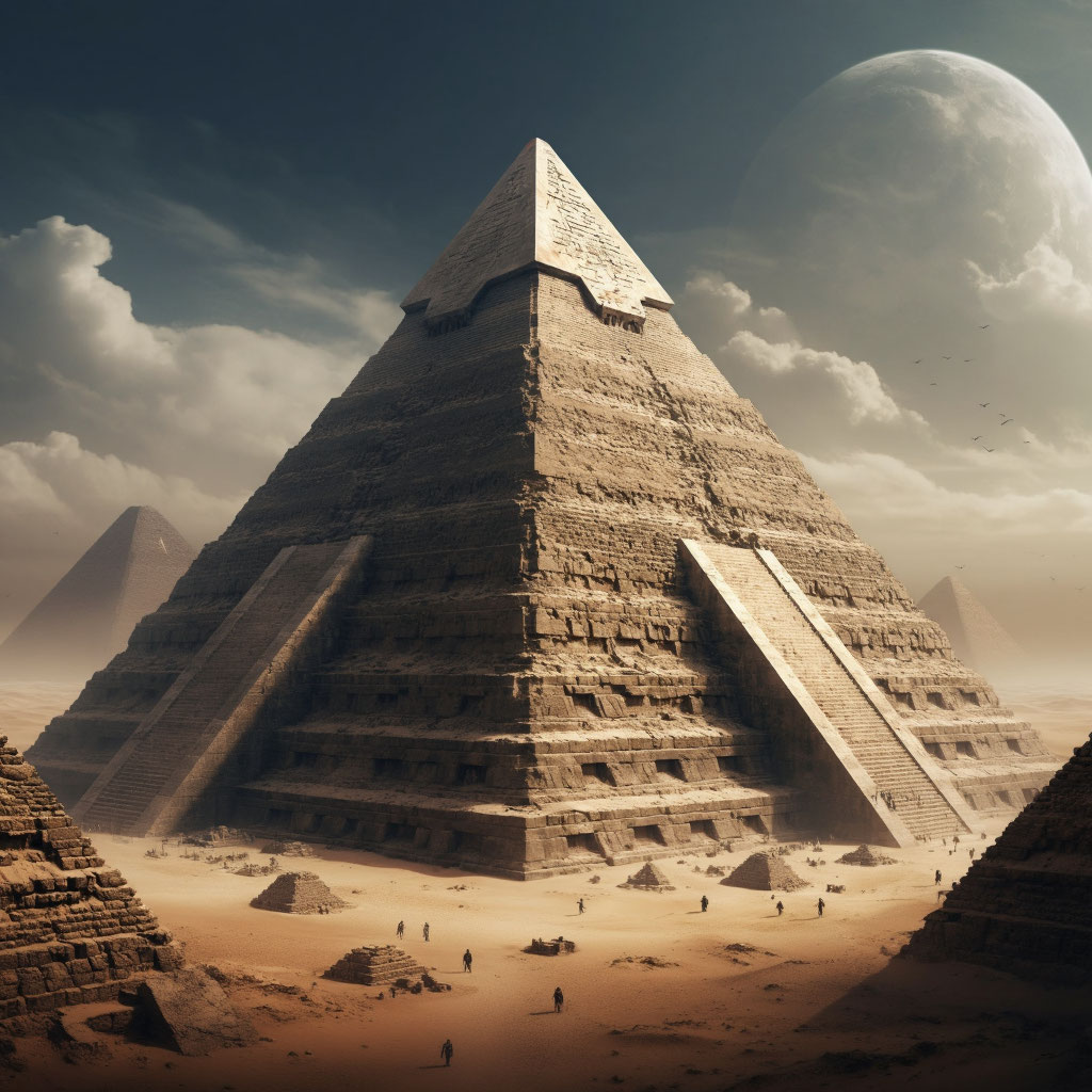 Грани пирамид больше не глухие каменные стены. Они выполнены из полупрозрачного кристаллического кварца, сквозь который можно разглядеть, как внутри пульсируют потоки энергии, мерцают руны и перетекают голографические проекции. Сама форма пирамид теперь не статична: она слегка меняется, дышит, подстраиваясь под нагрузку и текущие задачи. На вершинах возвышаются символы, каждый — воплощение сути хранилища. А у основания раскинулись врата измерений — величественные порталы, соединяющие эти места с иными мирами и временными линиями. Они вращаются, переливаются светом, шепчут тайнами бесконечности.