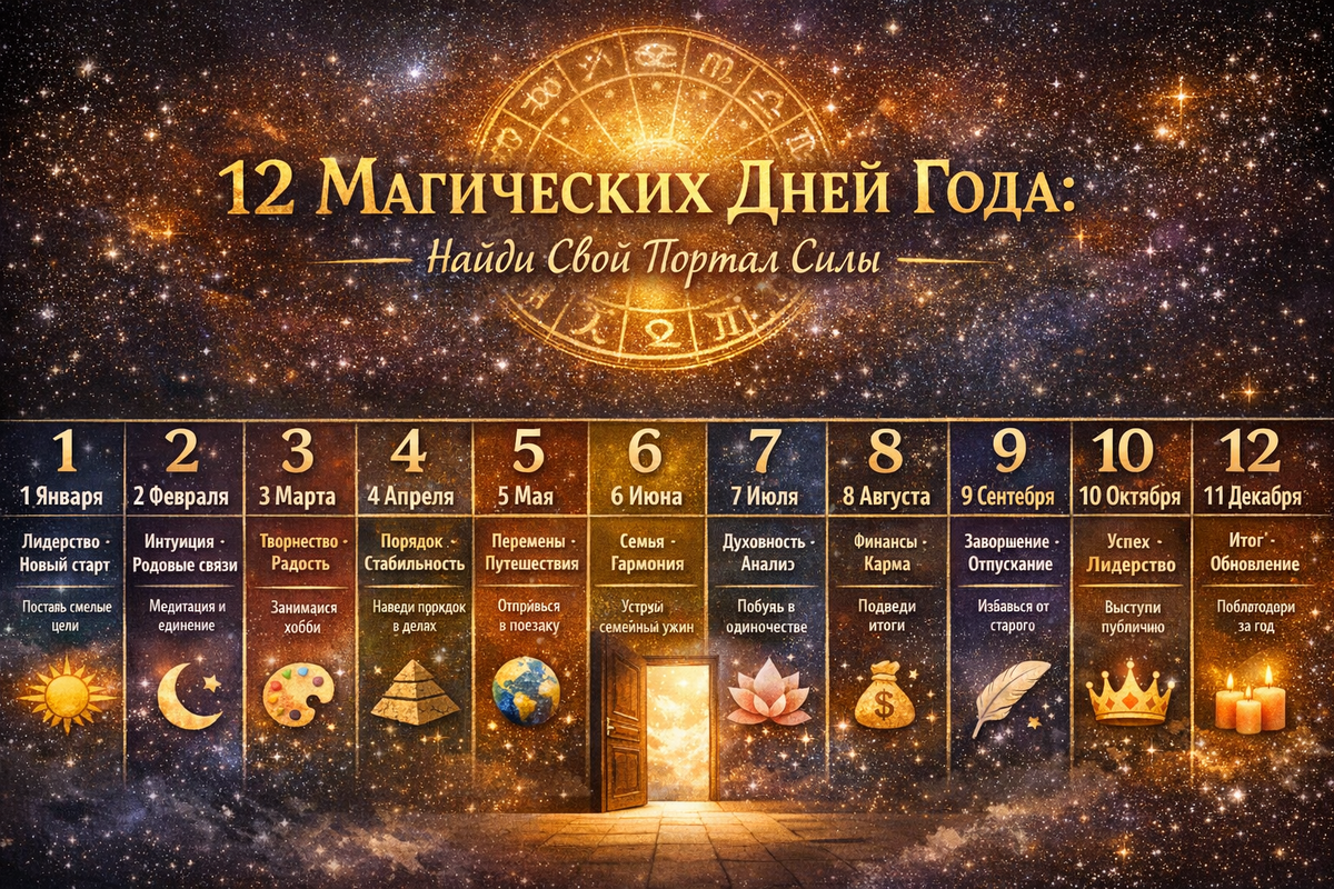Среди 365 дней года существуют двенадцать особых «портальных» дней. Они соответствуют двенадцати месяцам и двенадцати нумерологическим архетипам. В эти даты энергетическая связь между человеком и космосом становится максимально сильной. Это время для подведения итогов, загадывания желаний и перезагрузки судьбы.