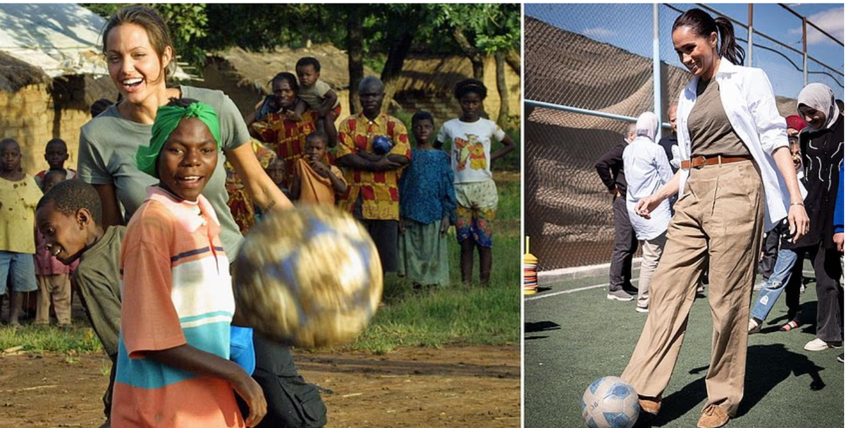 Дейли Мейл передумала и теперь считает, что Меган подражает не принцессе Диане или принцессе Кэтрин, а послу доброй воли Анджелине Джоли. Кстати, некоторое время назад инсайдеры сообщали, что Меган задумала усыновить ребенка. Ну, чтобы поправить свои дела хорошим пиаром. Потом слухи заглохли, но кто знает, насовсем ли. В Иордании стиль Меган каждинально отличался от того, что она демонстрировала в своих поездках в Колумбию и Нигерию. Она отказалась от своего обычного гламурного вида. Поездка в Иордании, куда Гарри и Меган отправились на Ближний Восток по приглашению ВОЗ, была посвящена психическому здоровью и помощи людям, пострадавшим от военных конфликтов. Они посещали реабилитационный центр для наркозависимых, медицинский центр, где лечатся пострадавшие беженцы из Газы. И Меган появлялась там в очень простой и даже скромной одежде от Zara. Сняла даже все свои бриллианты, оставив только браслет Cartier и обручальное кольцо. В Дейли Мейл заметили, что этот новый стиль очень похож на