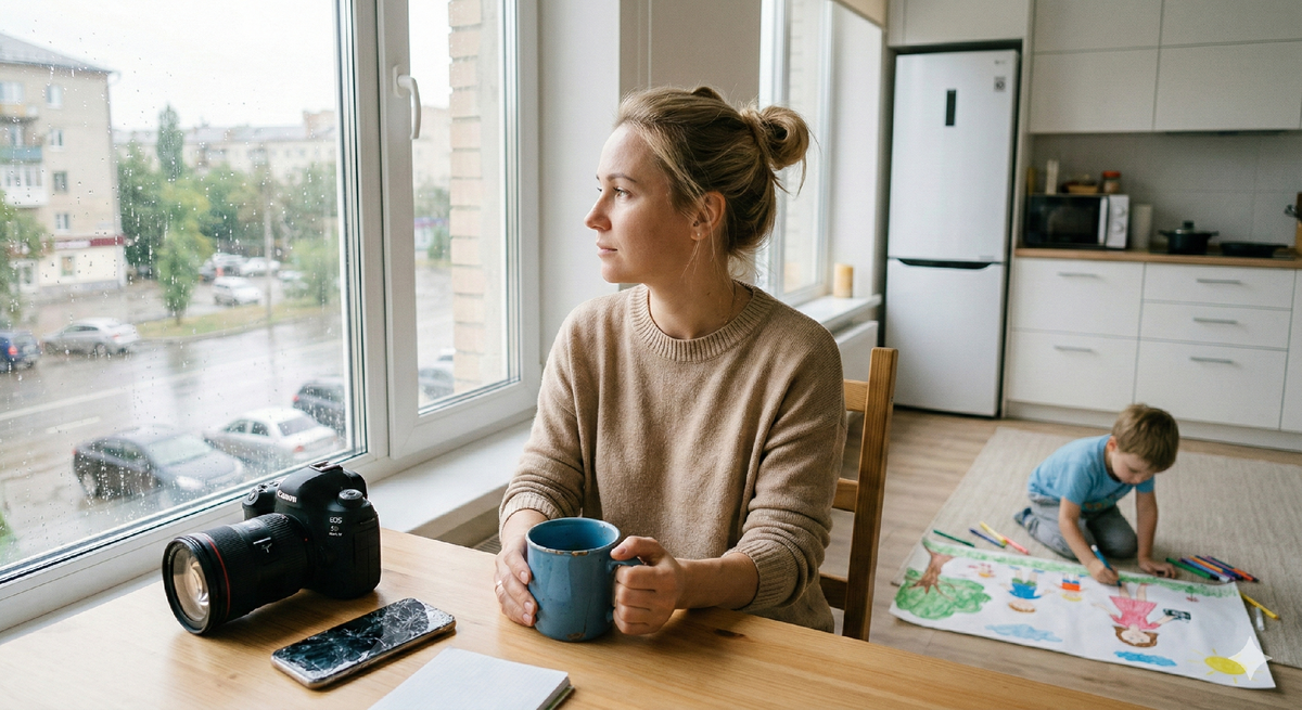 Через три месяца после развода я сидела на кухне. Тёмка рисовал за новым столом. Я подошла и заглянула через плечо. На листе был нарисован парк. Деревья, качели. И две фигурки. Одна — маленькая, с машинкой в руках. Вторая — побольше, с чёрным прямоугольником на шее. — Это кто, Тём? — спросила я, поправляя ему чёлку. — Это ты, мам. С камерой. Смотри, ты меня снимаешь.