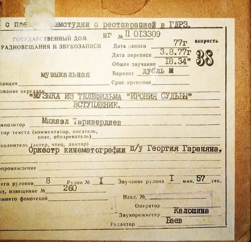 Как обычно в эти новогодние праздники вся страна смотрела бессмертную комедию Эльдара Рязанова "Ирония судьбы, или с лёгким паром". Эти показы были юбилейными. Впервые советские люди увидели фильм по ЦТ СССР 1 января 1976 года. Картина имела оглушительный успех и стала одним из символов новогодних праздников в нашей стране на следующие пятьдесят лет. Немаловажной причиной успеха "Иронии судьбы..." стала замечательная музыка Микаэла Таривердиева, в том числе и песни, которые Микаэл Леонович написал на стихи разных поэтов. В том числе и короткая песенка "На Тихорецкую состав отправится". Музыка из телефильма "Ирония судьбы, или с легким паром" почти сразу стала жить своей отдельной от фильма жизнью. Уже в начале 1977 года Государственный дом радиовещания и звукозаписи (ГДРЗ) сделал на 38 скорости профессиональную магнитофонную запись музыки из фильма Э. Рязанова. Эта мастер плёнка потом использовалась для создания грам пластинок и трансляций на радио. Правда на этой записи почему то песн