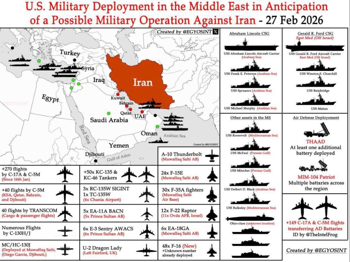 Востоке и в прилегающих районах, сконцентрированной для нанесения удара по Ирану. ВВС США: — более 270 военно-транспортных самолётов C-130J; — до 86 самолётов-заправщиков в воздухе KC-135R/T и KC-46A; — три самолёта радиоэлектронной разведки RC-135W Rivet Joint; — пять самолётов радиоэлектронной разведки E-11A; — шесть самолётов ДРЛОиУ E-3C/G; — один самолёт высотной разведки U-2S Dragon Lady; — два разведывательных БЛА RQ-4B Global Hawk; — до 54 истребителей F-16 в различных модификациях. ВМС США: — три эсминца типа Arleigh Burke из АУГ Abraham Lincoln в Аравийском море. — три эсминца типа Arleigh Burke из АУГ General R. Ford в Средиземном море. — два эсминца типа Arleigh Burke в Оманском и Персидском заливах для прикрытия баз США в Катаре, ОАЭ и Саудовской Аравии; — два эсминца типа Arleigh Burke в Красном море и Средиземном море для прикрытия Израиля; — одна ПЛАРК типа Ohio Georgia где-то в Средиземном море; — 10 самолетов ДРЛОиУ E-2D Hawkeye; — 12 истребителей F-3
