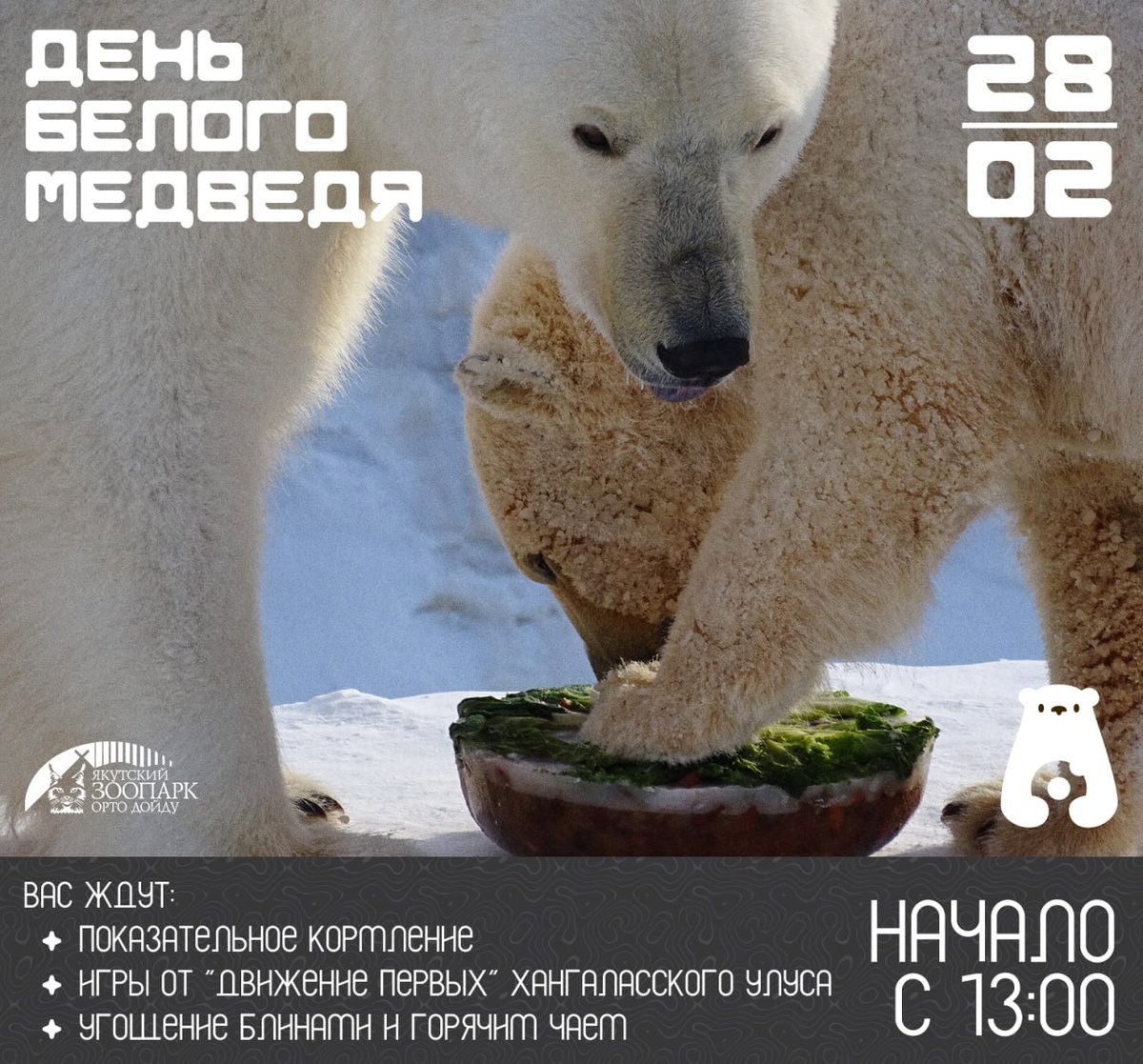! Друзья, приглашаем вас разделить с нами радость - отметить Всемирный день полярного медведя!🎉 Давайте вместе поздравим нашу замечательную медвежью семью: маму Колыману, папу Ломоносова и их дочку Яну. Специально для них мы приготовили особенный сюрприз - торт-мороженое! 🎂 Но и о наших дорогих гостях мы не забыли! Вас ждет насыщенная программа: ❄️ Показательное кормление белых медведей. Приходите посмотреть, как ваши любимцы будут лакомиться праздничным угощением! 🎯 Игры и веселье - за это отвечают ребята из "Движение первых" Хангаласского улуса. Будет задорно и интересно! 🥞 Горячий чай и вкусные блины - женский клуб "Тепло сердец", приготовили для всех гостей угощения. Согреемся вместе! Когда? 28 февраля (суббота), начало в 13:00. Приходите всей семьей, чтобы поздравить наших белых великанов и зарядиться отличным настроением! Ждем вас!💚 https://t.me/zoo_ortodoidu/186