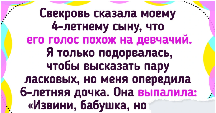 - Свекровь сказала моему 4-летнему сыну, что его голос похож на девчачий. Я только подорвалась, чтобы высказать пару ласковых, но меня опередила 6-летняя дочка. Она выпалила: "Извини, бабушка, но его голос звучит хорошо. А то, что ты сказала, - просто подло". Моя девочка. © Маша