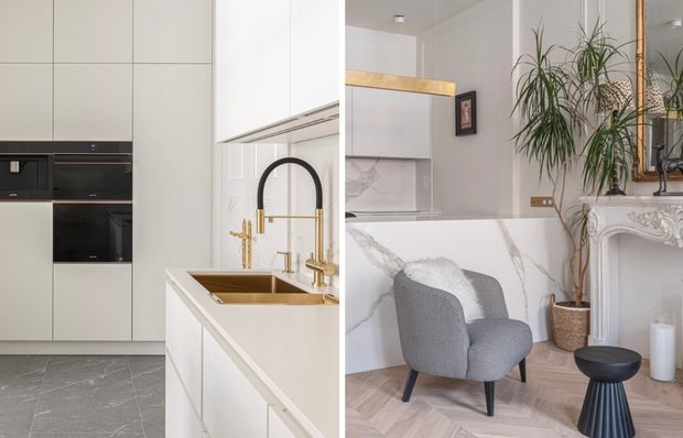 Фасады без ручек, гарнитур из Германии и латунная мойка — показываем вдохновляющую кухню-гостиную Дизайнер Оксана Пастернак создала интерьер двушки 72 кв. м в Москве для 19-летней девушки-студентки, которая любит путешествовать и проводить каникулы в Европе. Вдохновением послужила атмосфера парижских домов — высокие белые стены, деревянные окна и лепнина. Здесь объединили гостиную с кухней, создали прихожую с гостевым санузлом и постирочной, обустроили основную спальню с большим санузлом. Показываем, какой получилась кухня в этой невероятной квартире. Кухня-гостиная выдержана в белых тонах и минималистичном стиле — гарнитур словно растворяется в пространстве. Эффект достигается благодаря современному покрытию фасадов, которое не оставляет отпечатков и лишь слегка отличается по оттенку от стен. Гарнитур изготовили на заказ в Германии — без видимых ручек, с интегрированными профилями для открывания. Фасады от пола до потолка создают ощущение архитектурной стены. Доминантой пространства в
