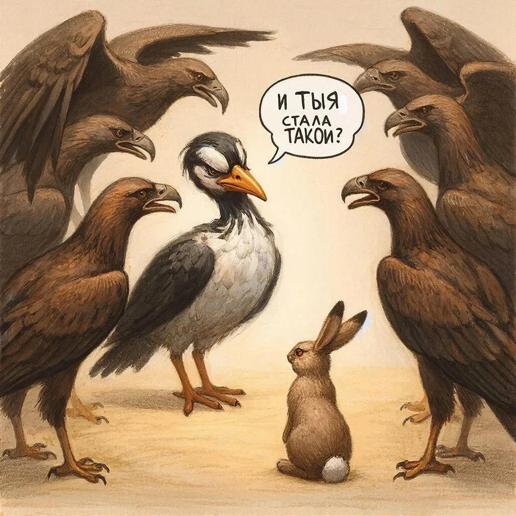 С тех пор Галка больше не поднималась на скалу. У неё не стало "крутой" стаи, зато появился друг. А Орлы... они быстро нашли новую галку, которая согласилась смеяться. Потому что тот, кто предал однажды, предаст снова, а тот, кто боится быть один, всегда найдёт, кого продать за место в стае.