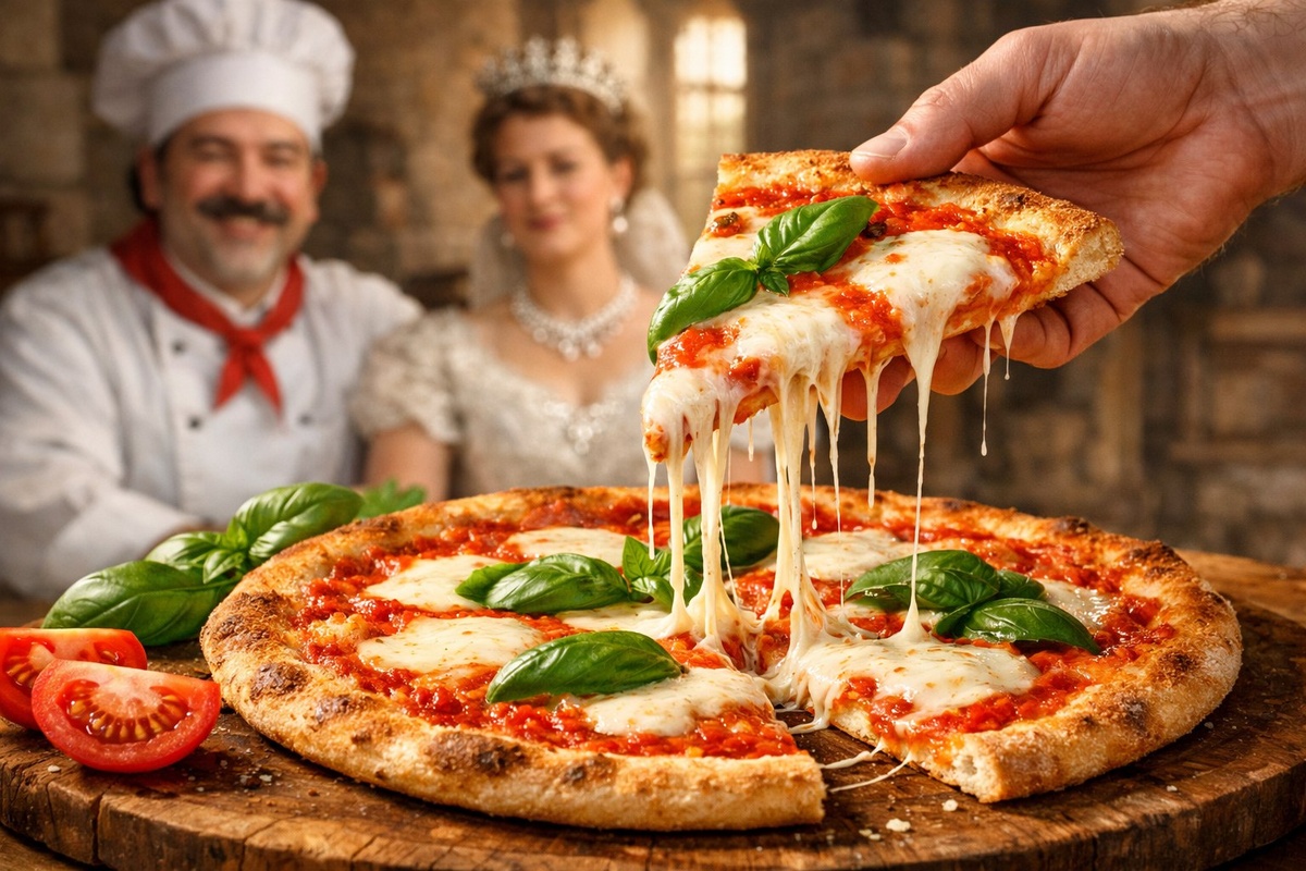 Конец XIX века. Италия только-только объединилась, и король Умберто I с супругой Маргаритой Савойской путешествуют по стране, чтобы завоевать любовь подданных . В 1889 году они приезжают в Неаполь — город, где пицца уже давно была едой бедняков. Уличные торговцы носили её в жестяных коробках на голове, а покупатели ели прямо на ходу, сложив треугольником . 🏙️