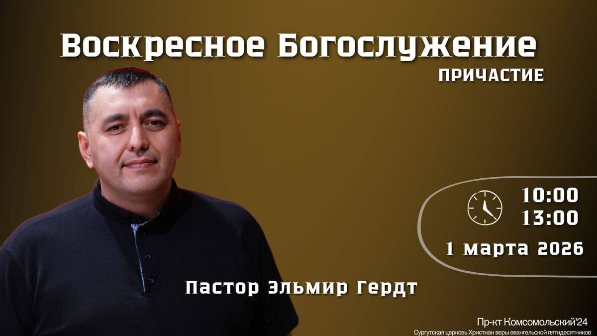! 📅 01.03.2026 🟡10:00 🟡13:00 📍Сургут, пр-т Комсомольский 24 📎 Пастор Эльмир Гердт ✝️Обратите внимание ➡️ Время служения 10:00 - общецерковное и детское служение. 13:00 - общецерковное и подростковое служение. Rutube канал ВК страница церкви Не забудьте подписаться ✍️