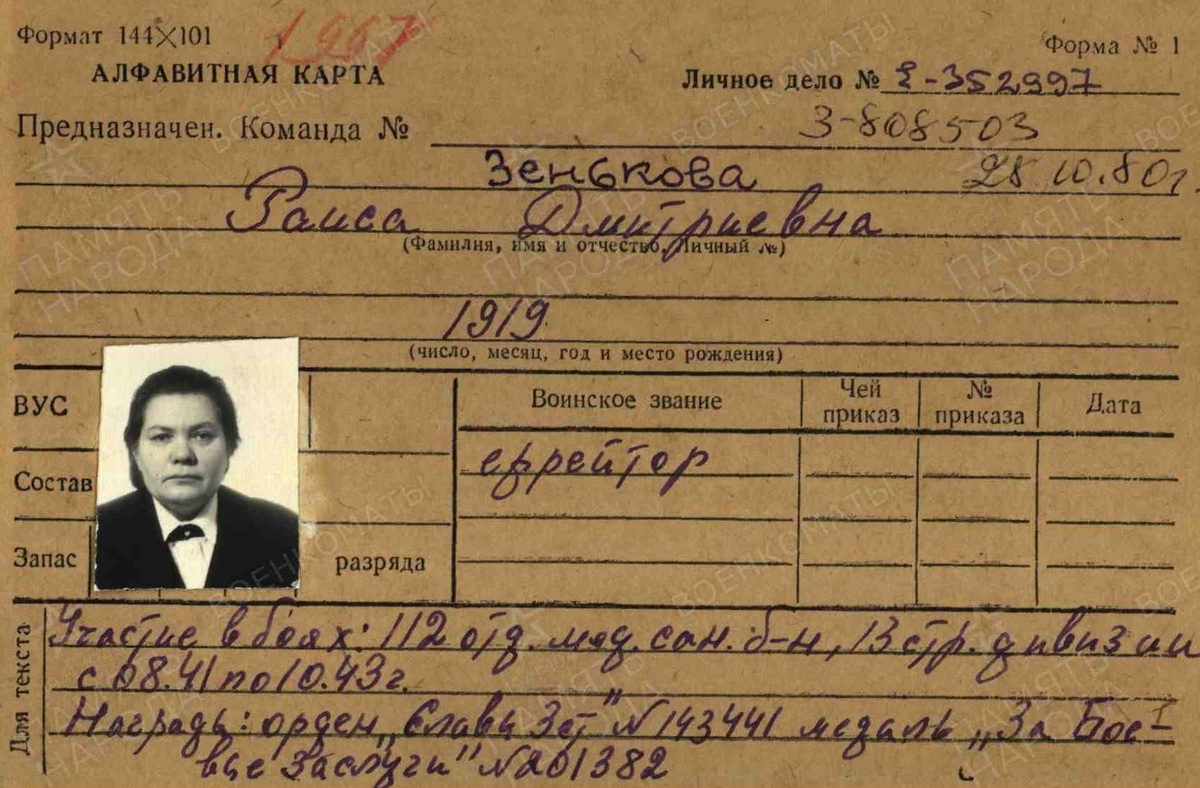 08.03.1943 санитар операционно-перевязочного взвода 112-го отдельного медикосанитарного-батальона ефрейтор Раиса Зенькова была награждена медалью «За боевые заслуги» приказом №21/н по 13-й стрелковой дивизии. В 1943 г. Рая вступила в ряды ВКП(б).