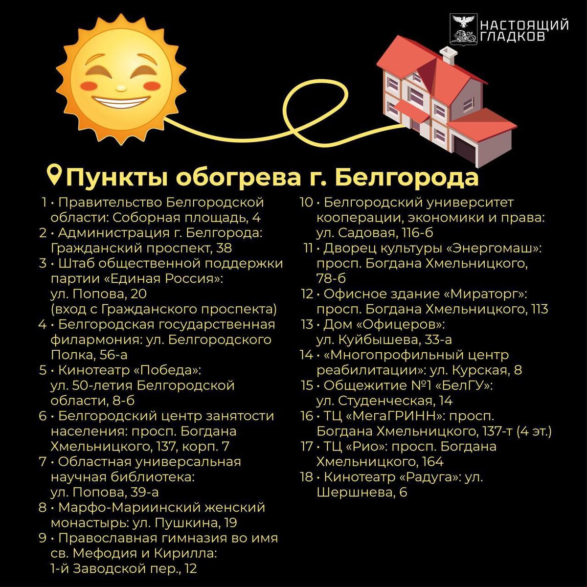 Губернатор Вячеслав Гладков попросил жителей, у которых нет тепла, холодной воды, электроэнергии, не работает канализация, дать обратную связь в комментариях. Также он отметил, что 9 пунктов временного обогрева, которые были названы вчера, продолжат работу и сегодня. С 9 часов утра начнут работу еще 9 пунктов временного обогрева. Мэрия|Белгород в 📱 ТГ 📱 ВК 💜 MAX В этом посте есть большое видео, которое не загрузилось в Дзен. Откройте оригинал поста в телеграме, чтобы его посмотреть
