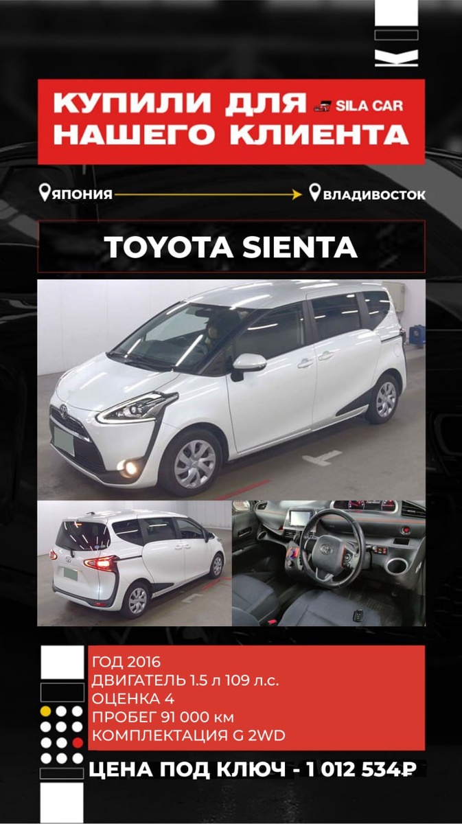 🔥 Никаких скрытых комиссий ❗️️Работаем строго по договору ┏ Реально честная комиссия: ┣ 50 000₽ на авто до 1 млн ₽ ┣ От 1 до 2,5 млн. ₽ - 70.000₽ ┗ От 2,5 млн. ₽ - 100.000₽ САМЫЕ ЧЕСТНЫЕ ЦЕНЫ НА РЫНКЕ ⬇️ Объём двигателя, см3 1500 Цена "на кнопке" ¥720 000 р.377 280,00 Комиссия за дорогую покупку ¥5 000 р.2 620,00 Расходы по Японии ¥70 000 р.36 680,00 Фрахт ¥55 000 р.28 820,00 Итого стоимость по инвойсу ¥850 000 445 400,00 ₽ Ставка таможенного платежа р.436 934,88 Тип силовой установки Топливо или параллельный гибрид Суммарная мощность, кВт 0,00 0 л.с. Утилизационный сбор* р.5 200,00 Брокерские услуги, СВХ, погрузо-разгрузочные работы, прохождение лаборатории р.65 000,00 Приёмка и забор автомобиля с СВХ, доставка до лаборатории, доставка до стоянки р.10 000,00 Честная комиссия СИЛА КАР р.50 000,00 Итого во Владивостоке: 1 012 534,88 ₽ 🔴Купил менеджер Даниил 📞 +7(908)979-36-95 🔵@SilaCarDAN 👉Для РАСЧЕТА СТОИМОСТИ АВТО жмите сюда💪 💻Самостоятельный