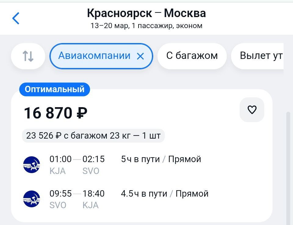 : 📍Много Москвы на март за 16500₽ ↔️ на школьные каникулы уже нет таких цен https://aviasales.tpm.lv/e0JFPQzg 📍Продолжается мильная акция в Азию на март. Из Красноярска дают Пхукет. 19100₽ ➡️ + 1000 миль. 📍Промокод XFEVZ5B даёт скидку 5% на некоторые билеты или не даёт 😂 @KJA / KJA MAX