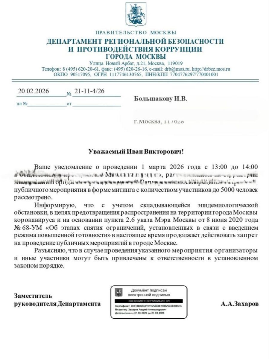 ‼️Мэрия Москвы запретила митинг против блокировки Telegram из-за «распространения коронавируса», — СМИ.