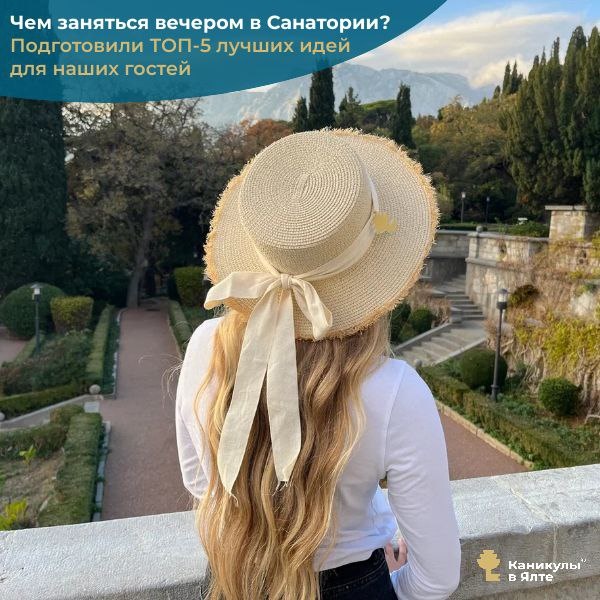 ! Вечером в Санатории «Каникулы в Ялте» каждый легко найдёт занятие по душе. Мы подготовили подборку лучших идей для вашего времяпрепровождения👇 1. Прогулки по Набережной или по аллеям парка «Харакский» — беспроигрышный вариант, который подарит приятные эмоции и расслабление. 2. Спортивные игры (дартс, теннис и др.) или посещение тренажёрного зала дадут заряд бодрости и энергии. 3. Атмосферные локации санатория с панорамными видами — идеальное место для спокойного вечера, красивых фотографий и наслаждения природой. Обязательно посетите: - Капитанский мостик - Смотровую площадку у Дачи профессора Малышева - Смотровую площадку у «Античной колоннады» - Смотровую площадку «Романтическая» - Беседка желаний - Крымская Швейцария 4. Настольные игры — отличный способ провести вечер весело и в хорошей компании. 5. Дискотека «Танцуют все» — зажигательная музыка, отличное настроение и море позитивных эмоций. Пусть каждый вечер у моря будет наполнен лёгкостью, тёплым воздухом и приятными м