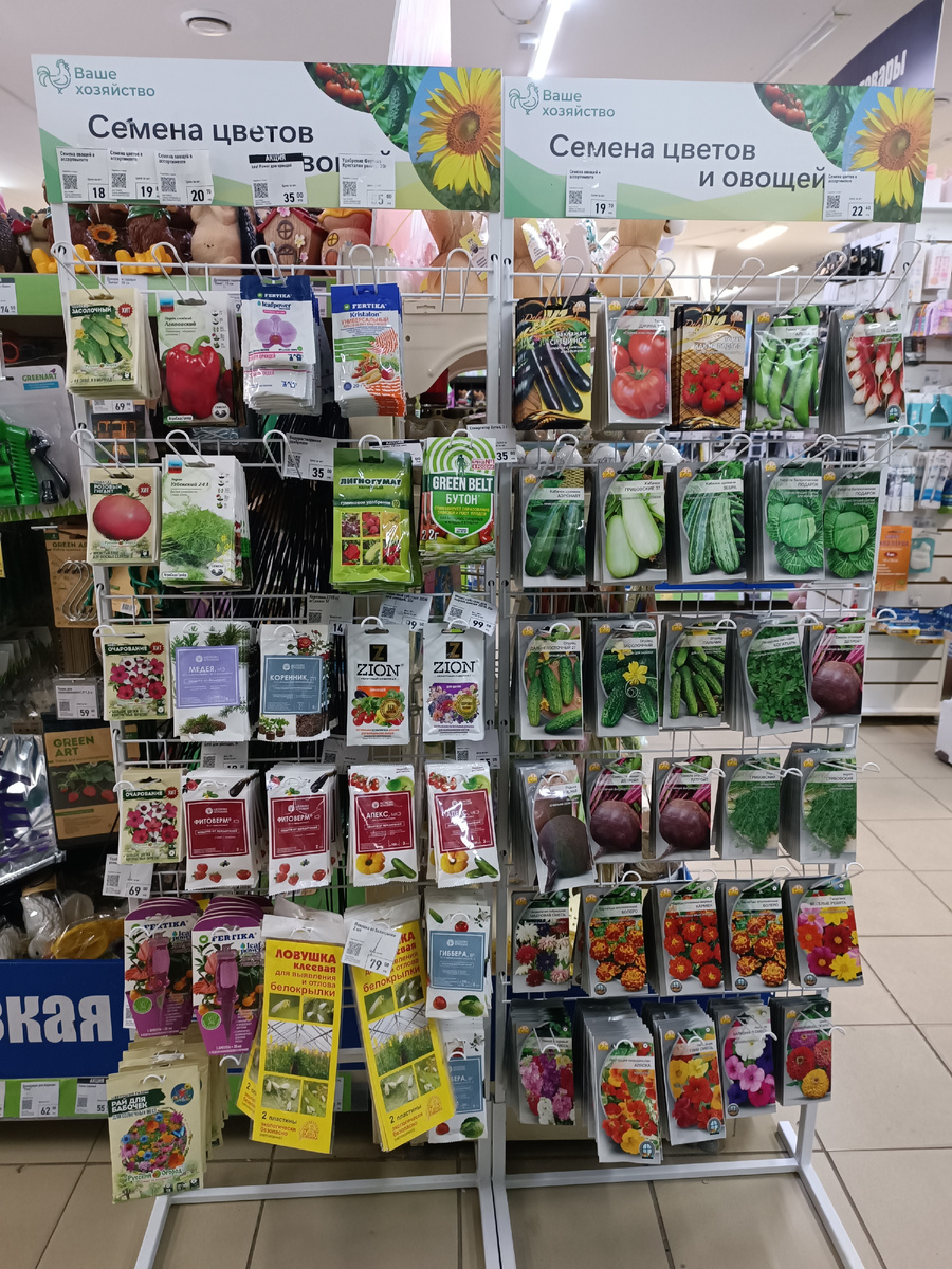 Теперь здесь две стойки выставлены с семенами, раньше всегда была только одна. и не только семена, но и удобрения туда повесили. Зато удобно смотреть. Ценники на верхней плашке.